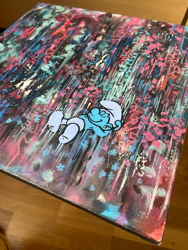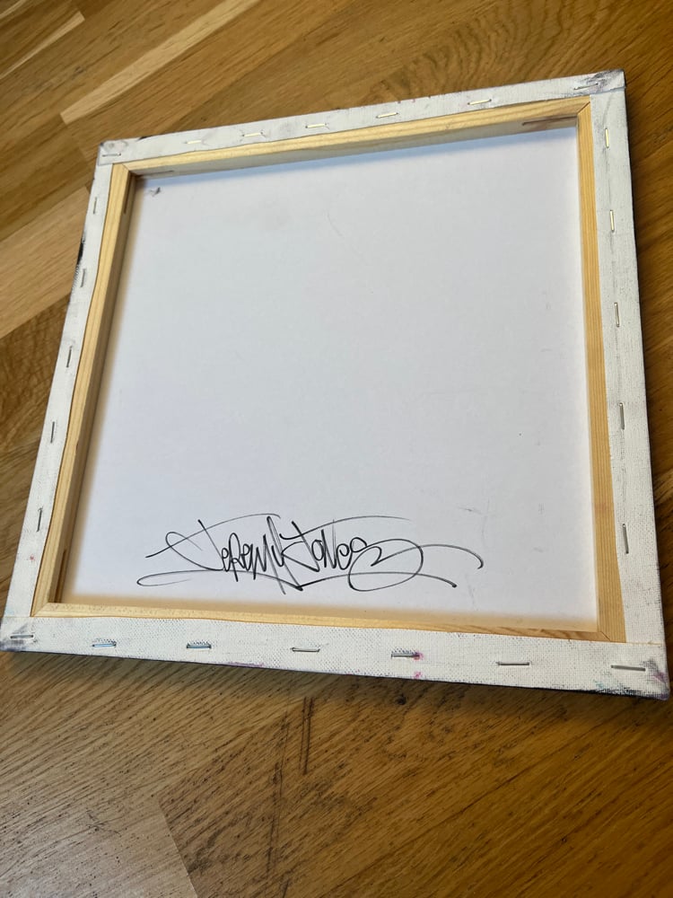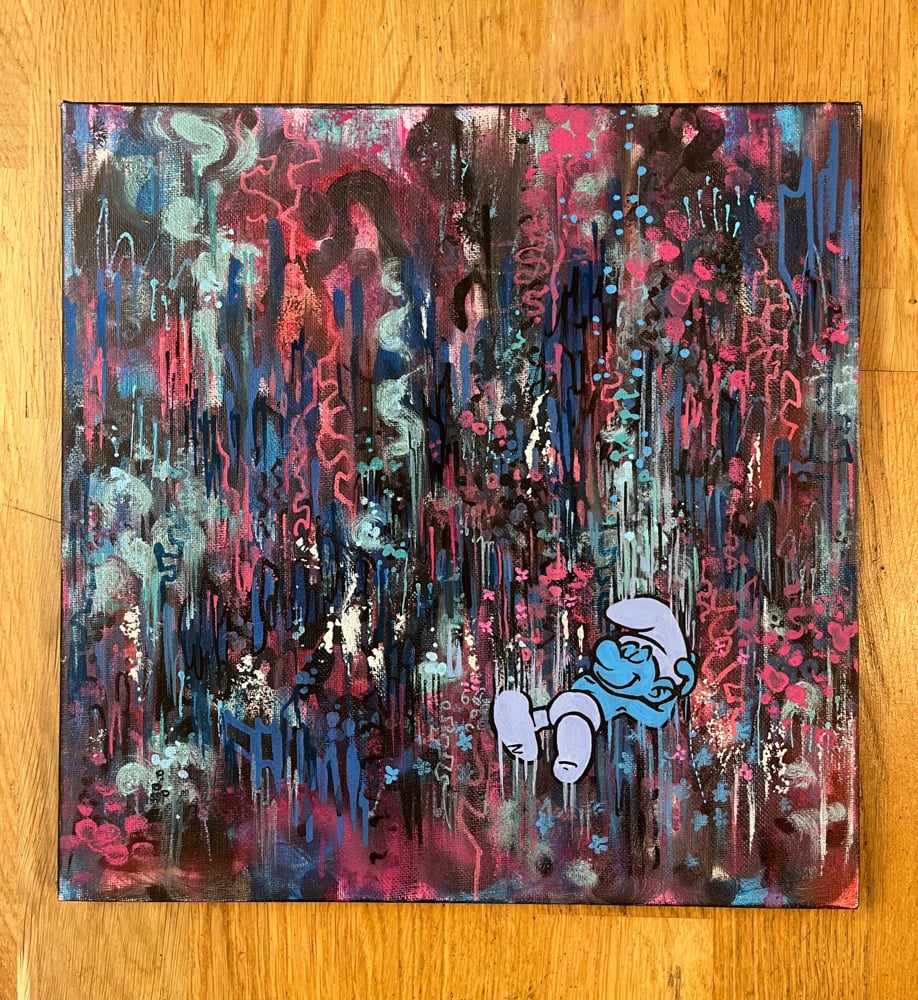 Hand painted acrylic on 30.5 x 30.5 x 1cm rigid back canvas. Signed on the back