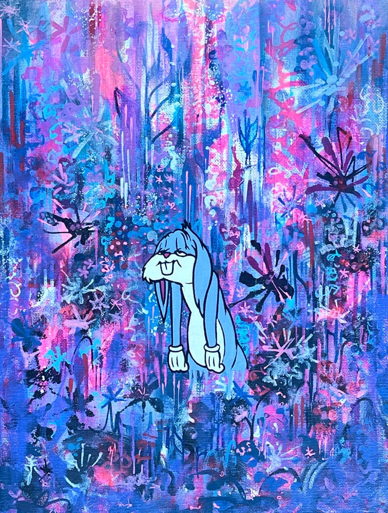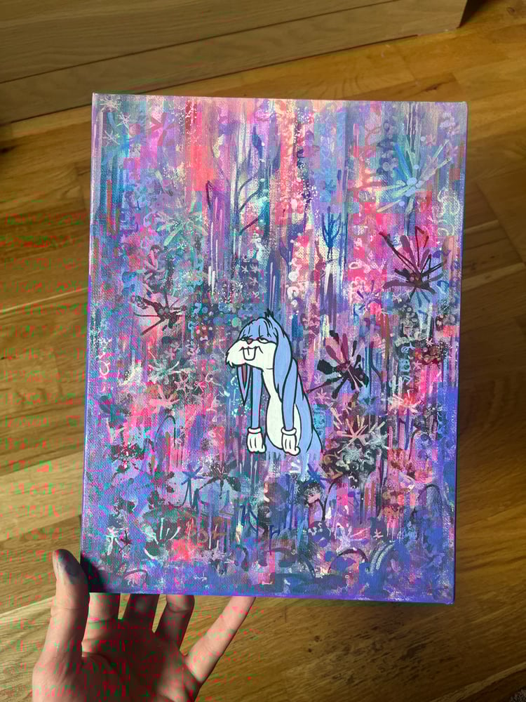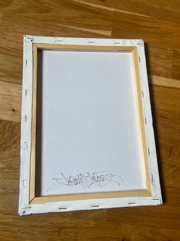 Hand painted acrylic on 23 x 31 x 1cm rigid back canvas. Signed on the back